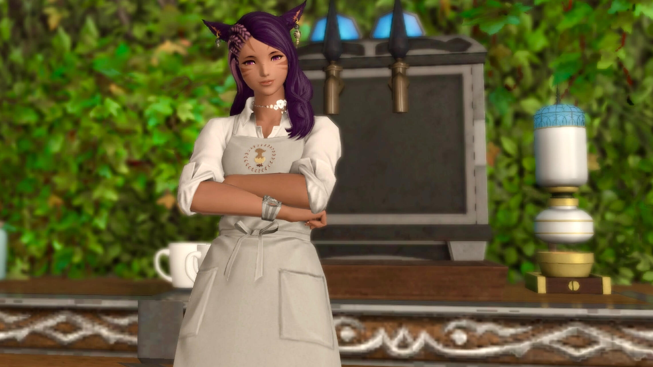 Purple hair with lilac highlights, an outgoing personality, and a mischievous grin... those are S'koe's trademarks. The catte behind the counter is happy to talk anything food and/or beverage related, from the nuances between cane and palm sugars in baking, to the best blend of wheat, corn, and rye for distilling whisky.Don't let her flirty nature fool you, she's just being nice... unless you happen to be her kind of viera, and then she is most definitely flirting with you.