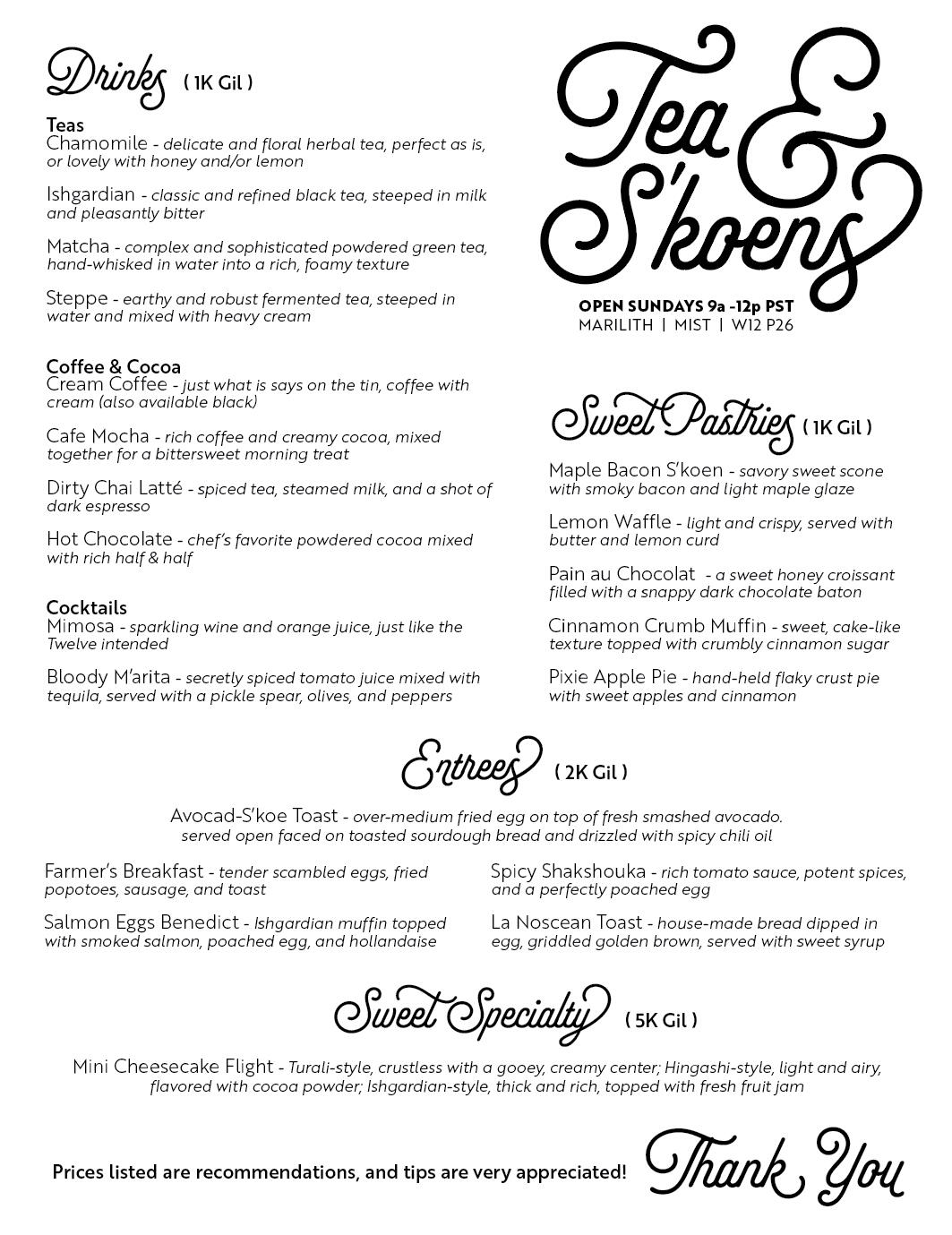Tea & S'koens is an 18+ SFW roleplay-friendly venue. While the staff appreciates a well-placed innuendo, please keep any "spicy" conversations in private channels. We welcome RP veterans and beginners alike, and are more than happy to help any players new to RP get a feel for it. Patrons are encouraged to remain in character and clearly denote when speaking out of character ((which happens... a lot)). We certainly hope you enjoy your time here, and if you have any questions or concerns, please /tell S'koe Nibbs with your comments.